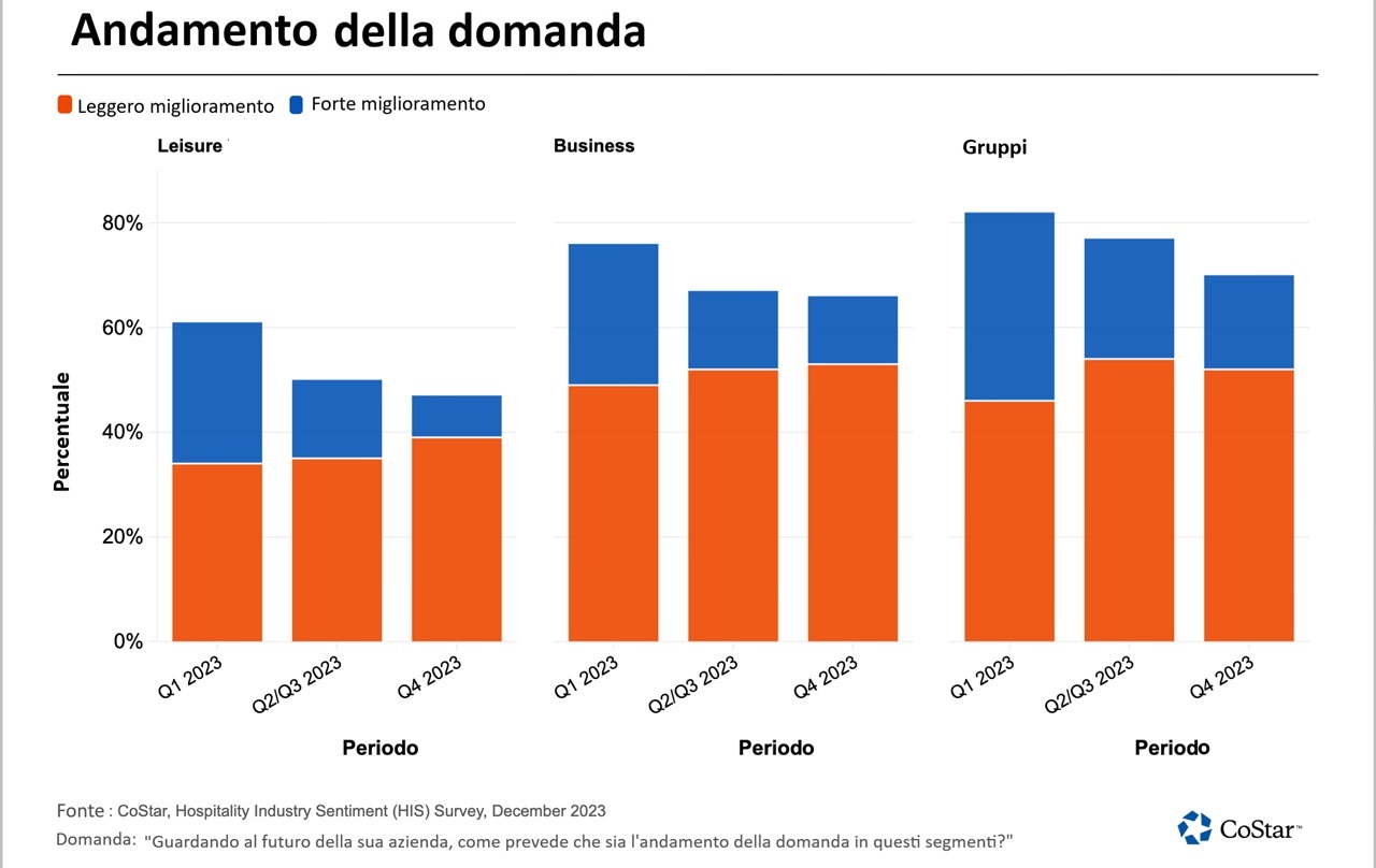Tuttavia, la percentuale degli intervistati che si aspetta un “forte miglioramento” o “un certo miglioramento” sia dei clienti leisure che di quelli business sia dei gruppi tende lentamente al ribasso. Nella tabella qui sotto, si vede come è andato il 2023.