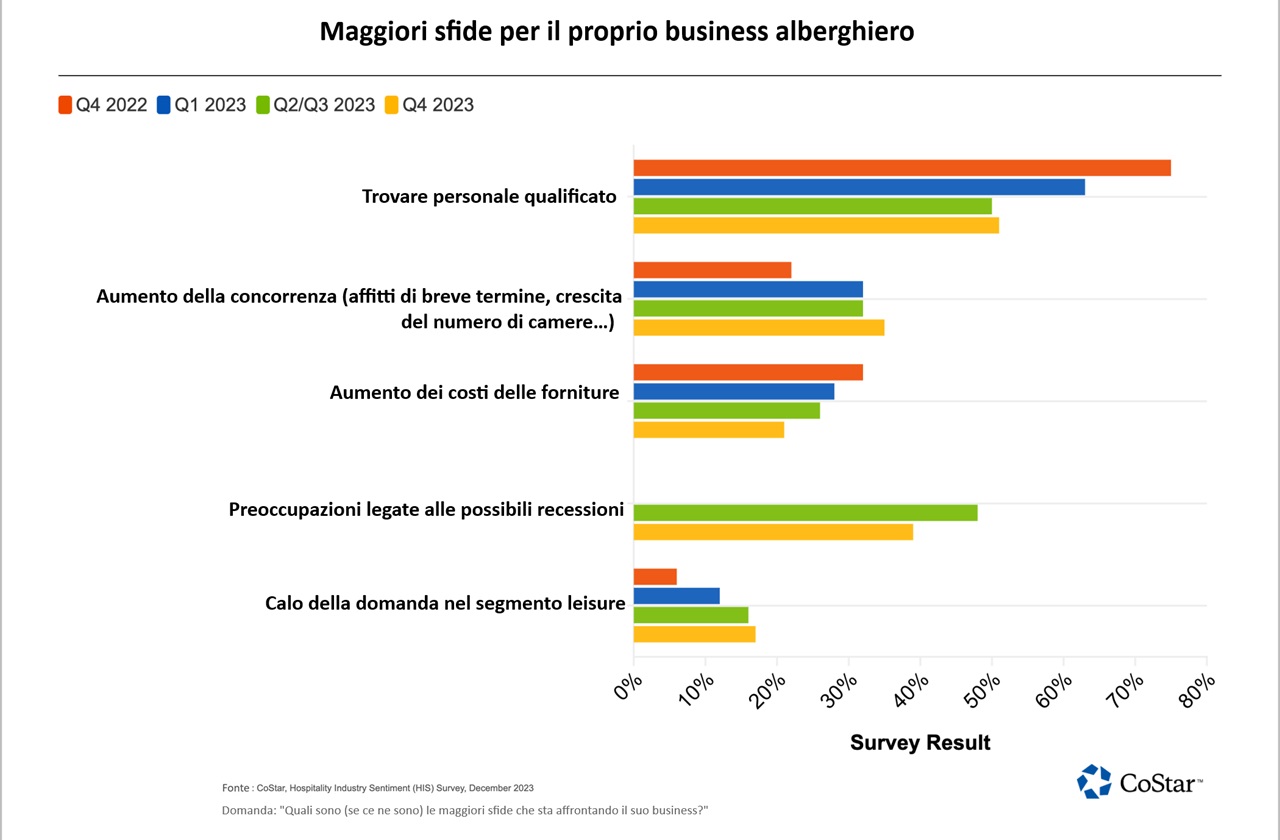 La buona notizia è che (pare) le difficoltà sarebbero in diminuzione. Anche se è importante notare che le questioni legate al lavoro continuano a essere la sfida più grande per il settore alberghiero a livello mondiale. Adirittura maggiori delle preoccupazioni di recessione.