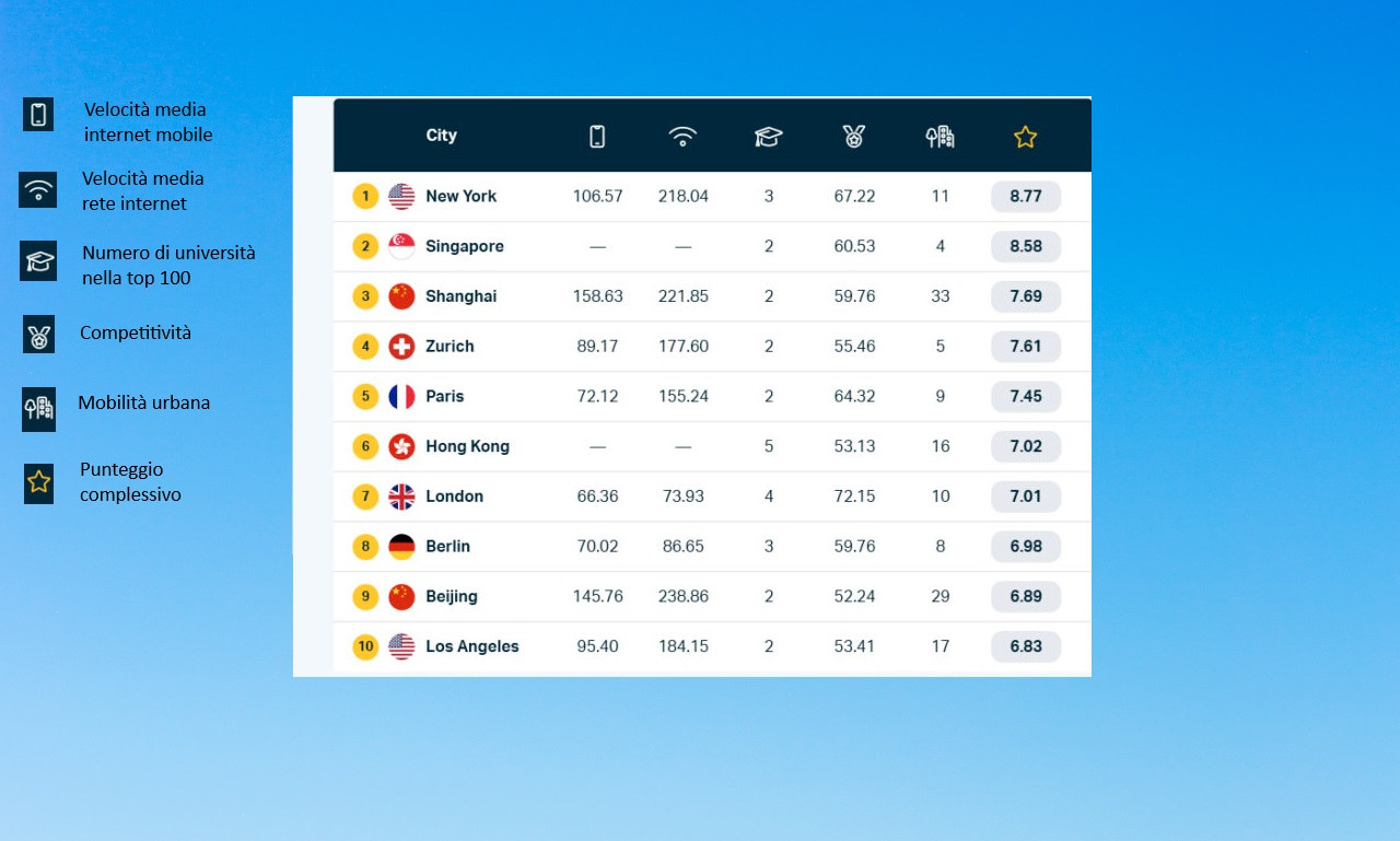 Shanghai ha la velocità internet mobile media più elevata tra tutte le città analizzate, attestandosi a 158,63 Mbps. La città è inoltre al secondo posto per la velocità media della banda larga fissa, al sesto per il numero di università tra le prime 100 e al settimo per il punteggio di competitività. Quest’ultimo comprende anche temi come l’attività commerciale, il capitale umano, l’esperienza culturale e l’impegno politico.