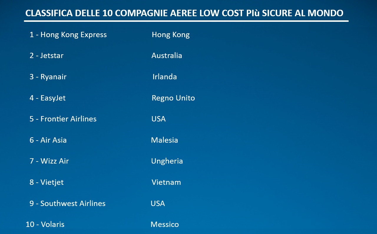 AirlineRatings ha stilato una classifica delle 10 compagnie aeree low cost più sicure. Questo sito di recensioni di compagnie aeree, che con esperti del settore valuta ogni parametro legato al tema sicurezza.