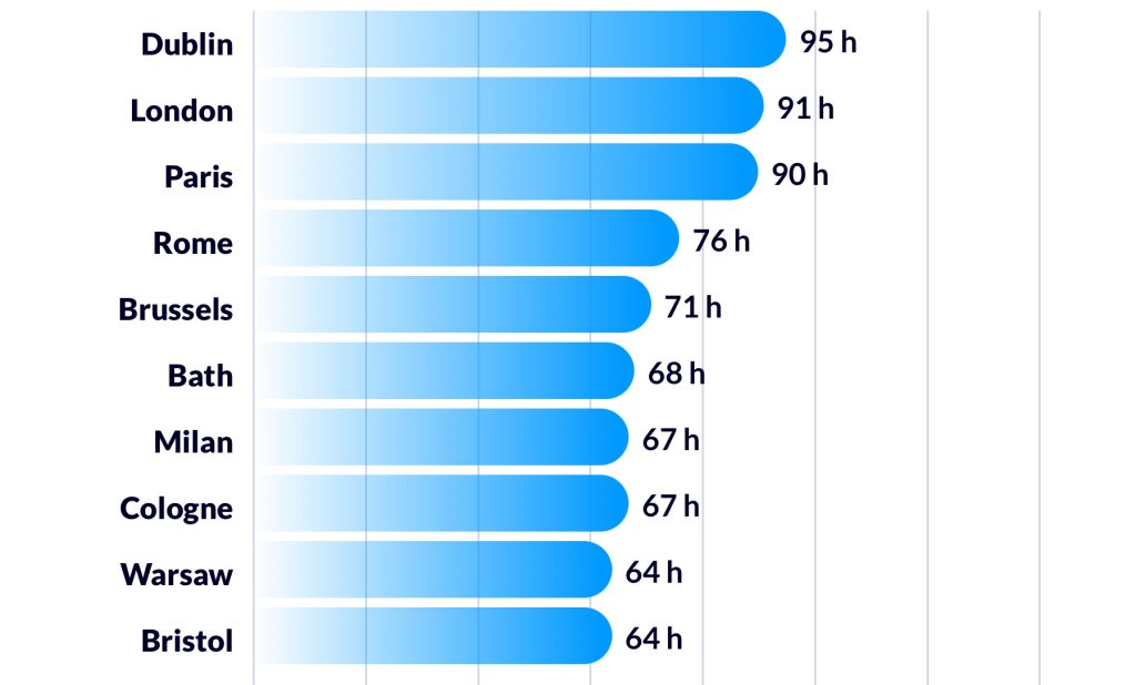 Le sei peggiori città nella Inrix Global Traffic Scorecard sono anche quelle dove si perde più tempo: Istanbul (118 ore annue), Mexico City (108), Chicago (112), New York (102), Philadelphia (101) e Cape Town (96). La top ten è completata da Londra, Parigi, Jakarta (capitale dell’Indonesia) e Los Angeles: ma secondo l’analisi, si viaggia peggio a Dublino dove chi guida perde 95 ore annue.