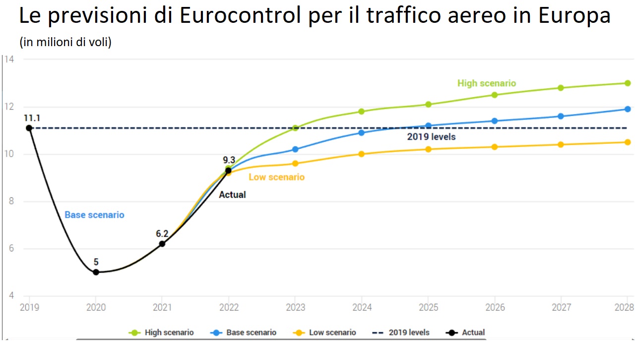 Le stime di Eurocontrol, organizzazione intergovernativa cui partecipano 41 paesi europei, indicano che solo nel 2025 si ritornerà ai livelli di traffico aereo del 2019. Come si vede dalla tabella qui sotto, ci sono 3 scenari: uno ottimistico (in verde) che ipotizza un ritorno ai livelli del 2019 già a fine 2023. Uno realistico (in blu) che prevede il 2025 e uno pessimistico (in arancio) che non vede un ritorno ai livelli prepandemia nei prossimi anni.