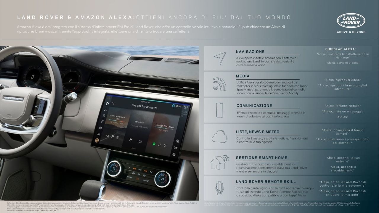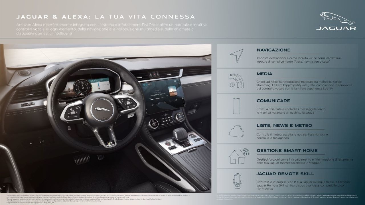 Continua: «Siamo entusiasti di poter offrire la medesima piacevole e fruibile esperienza ai proprietari di Jaguar e Land Rover. Con il passare del tempo, Alexa sta diventando sempre più intelligente e, per questo, in futuro verranno aggiunte nuove funzionalità e capacità, che saranno disponibili in modo automatico per tutti i veicoli».