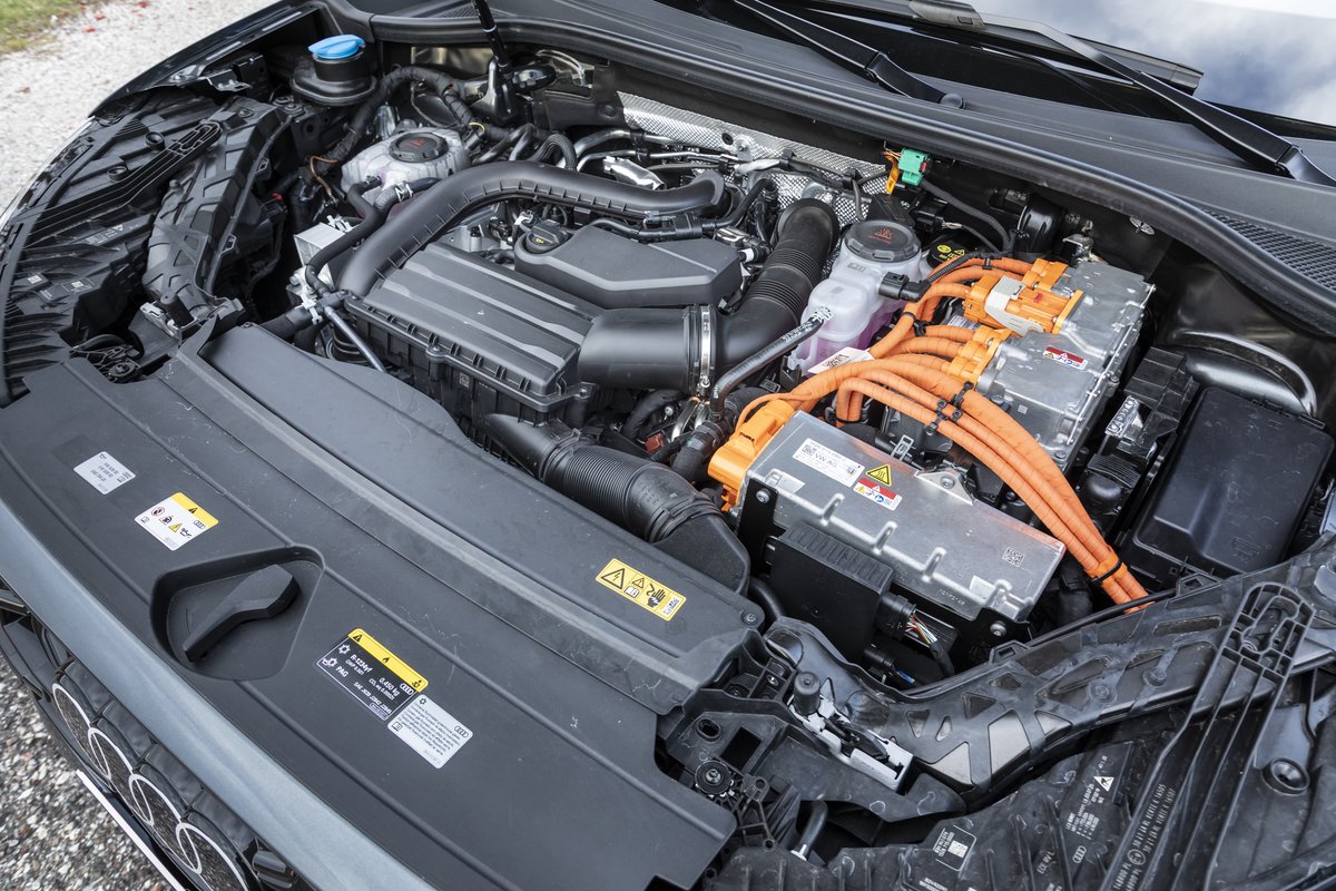 Sotto al cofano, il rinnovato 1.5 TFSI Evo, un 4 cilindri turbo a ciclo Miller con pressione benzina di 350 bar e tanto di canali lubrificazione nei pistoni. Si sposa a un motore elettrico, PSM da 116 CV, integrato nel cambio S-tronic, generando 272 CV disponibili, con 400 Nm di coppia, per fare lo 0-100 in 6,8 secondi. La batteria, ora da 25,7 kWh grazie a 96 celle ma di pari ingombro alla precedente serie, permette autonomia elettrica fino a 119 km in Wltp. E si ricarica molto rapidamente: fino ai 50 kW DC, passando da 10% a 80% in mezzora, oppure in AC a 11 kW.