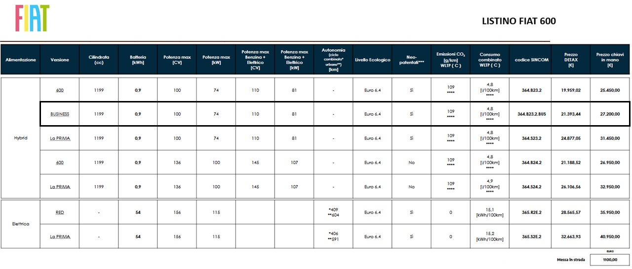 Per la 600 Hybrid Business, il prezzo chiavi in mano parte da 27.200 euro. Il canone della formula di noleggio a lungo termine è uguale: 129 euro al mese per 48 mesi e un anticipo di 8.199 euro.