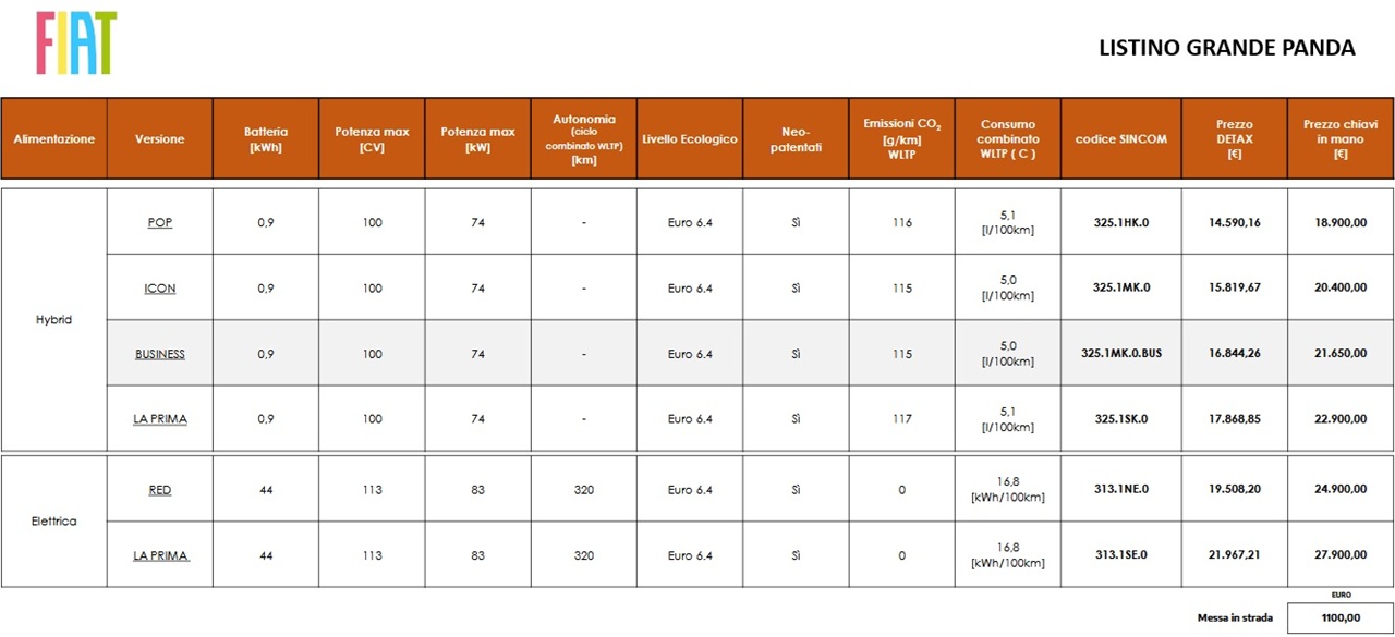 Il listino prezzi chiavi in mano? Parte da 21.650 euro per la Grande Panda Hybrid Business che prevede una formula di noleggio a lungo termine con un canone di 129 euro per 48 mesi ed un anticipo di 6.899. Questa offerta scade il 30 aprile.