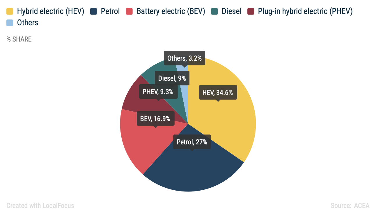Da gennaio a novembre 2025, le vetture a benzina hanno registrato un calo vicino al 19%, con una quota di mercato scesa al 27%, mentre il diesel ha subito una contrazione ancora più marcata, perdendo oltre il 24% e fermandosi intorno al 9%.
