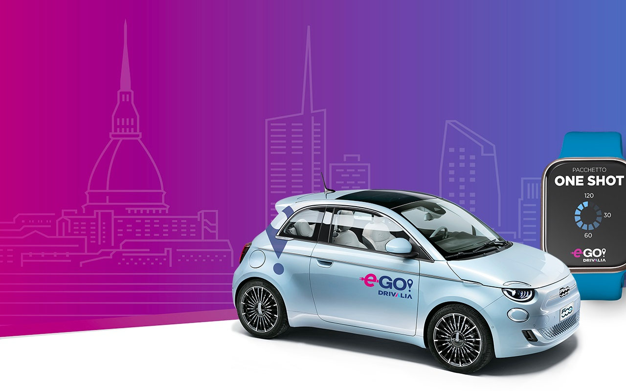 e-GO! Drivalia. Il pacchetto comprende 24 ore di guida al mese inclusi per tre mesi e utilizzabili come si crede a bordo di una 500 Full Electric.