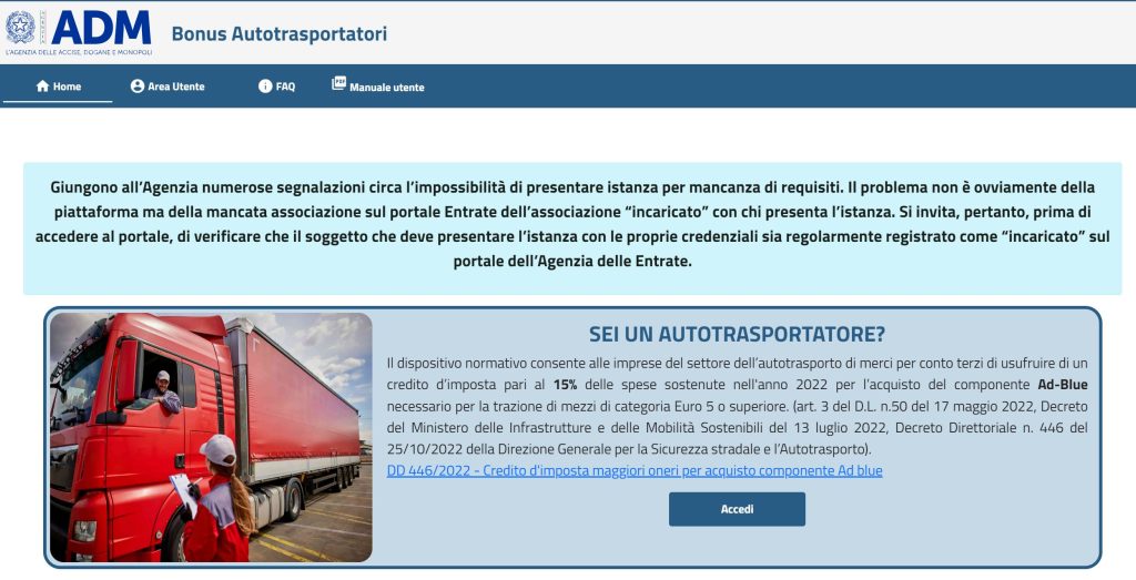 Questo è il link diretto per accedere e richiedere il credito d’imposta per aziende che usano veicoli con sistema ADBlue. L’accesso non è libero, avviene tramite identificazione SPID, CNS o CIE.