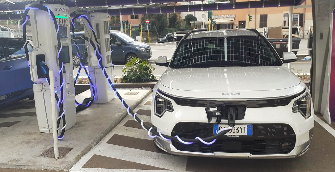 Nell’area esterna dello store – che è il primo in ordine di tempo a marchio Kia – ci sono i punti di ricarica, aperti ai possessori di auto alla spina di qualunque marchio.
