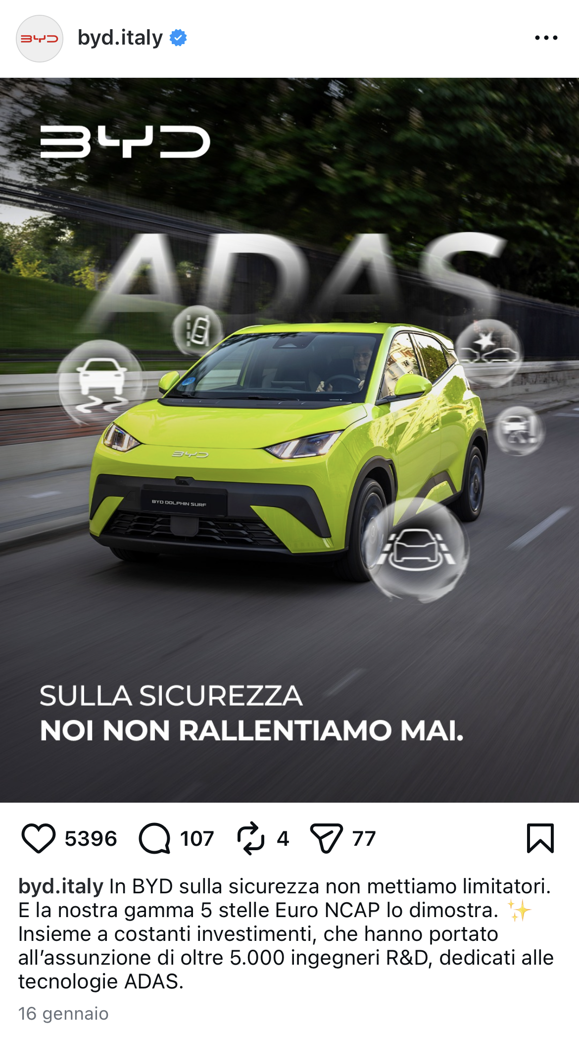 La presa in giro sulla cinghia a bagno d’olio non sono l’unica “punzecchiatura” lanciata dal brand cinese verso Stellantis. Negli scorsi mesi, sull’account Instagram di BYD Italia è infatti apparso un post dedicato alla Dolphin Surf con la scritta: “Sulla sicurezza noi non rallentiamo mai!“.