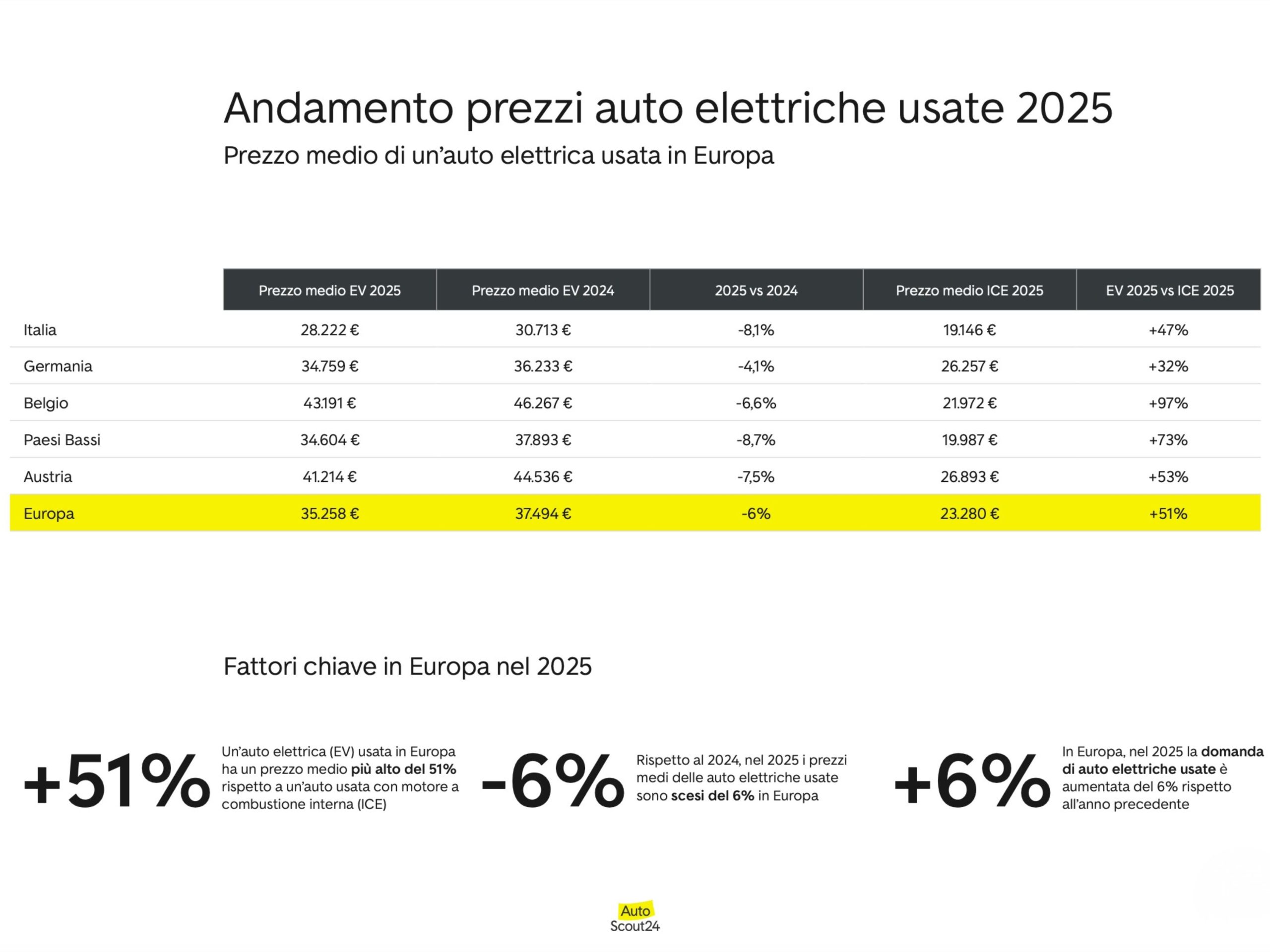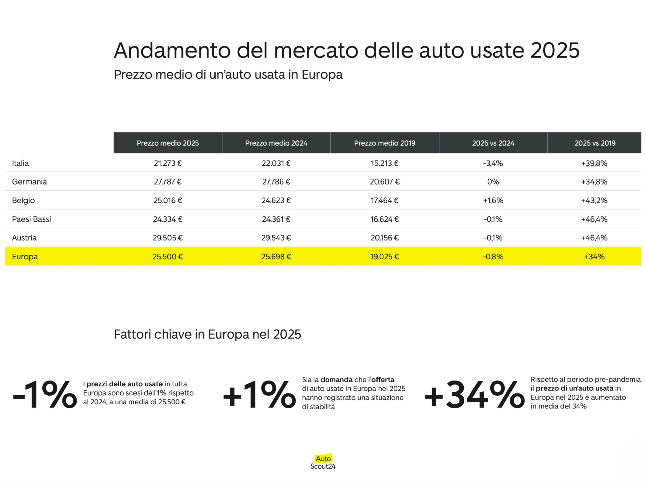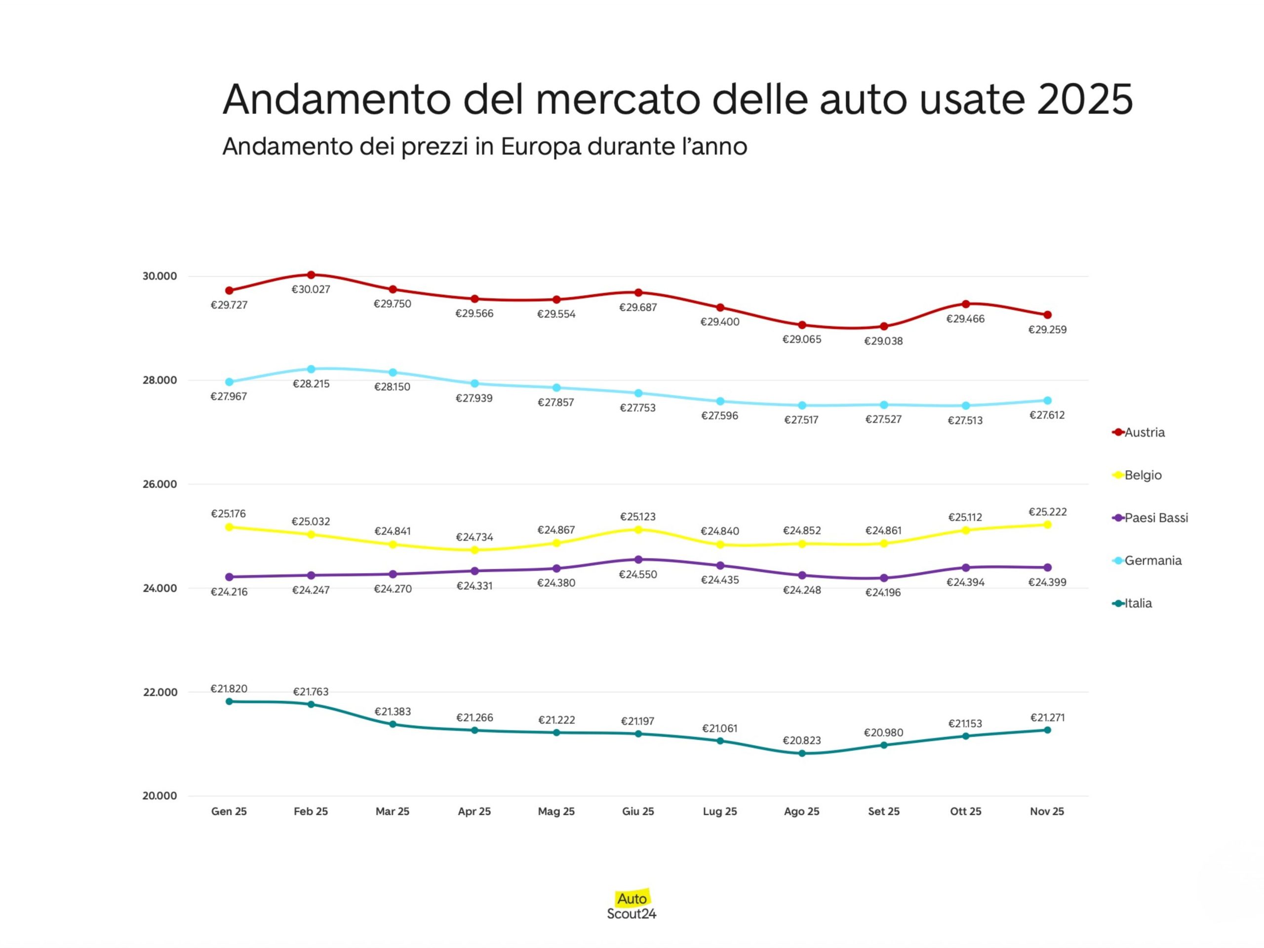I dati arrivano dall’Europa Report 2025 di AutoScout24 (consultabile al seguente link). Si tratta di uno studio che analizza l’andamento del mercato dell’usato in cinque Paesi chiave – Italia, Germania, Belgio, Paesi Bassi e Austria – sulla base delle ricerche degli utenti, dei prezzi medi degli annunci e dei volumi di domanda e offerta rilevati sulla piattaforma tra gennaio e novembre 2025.