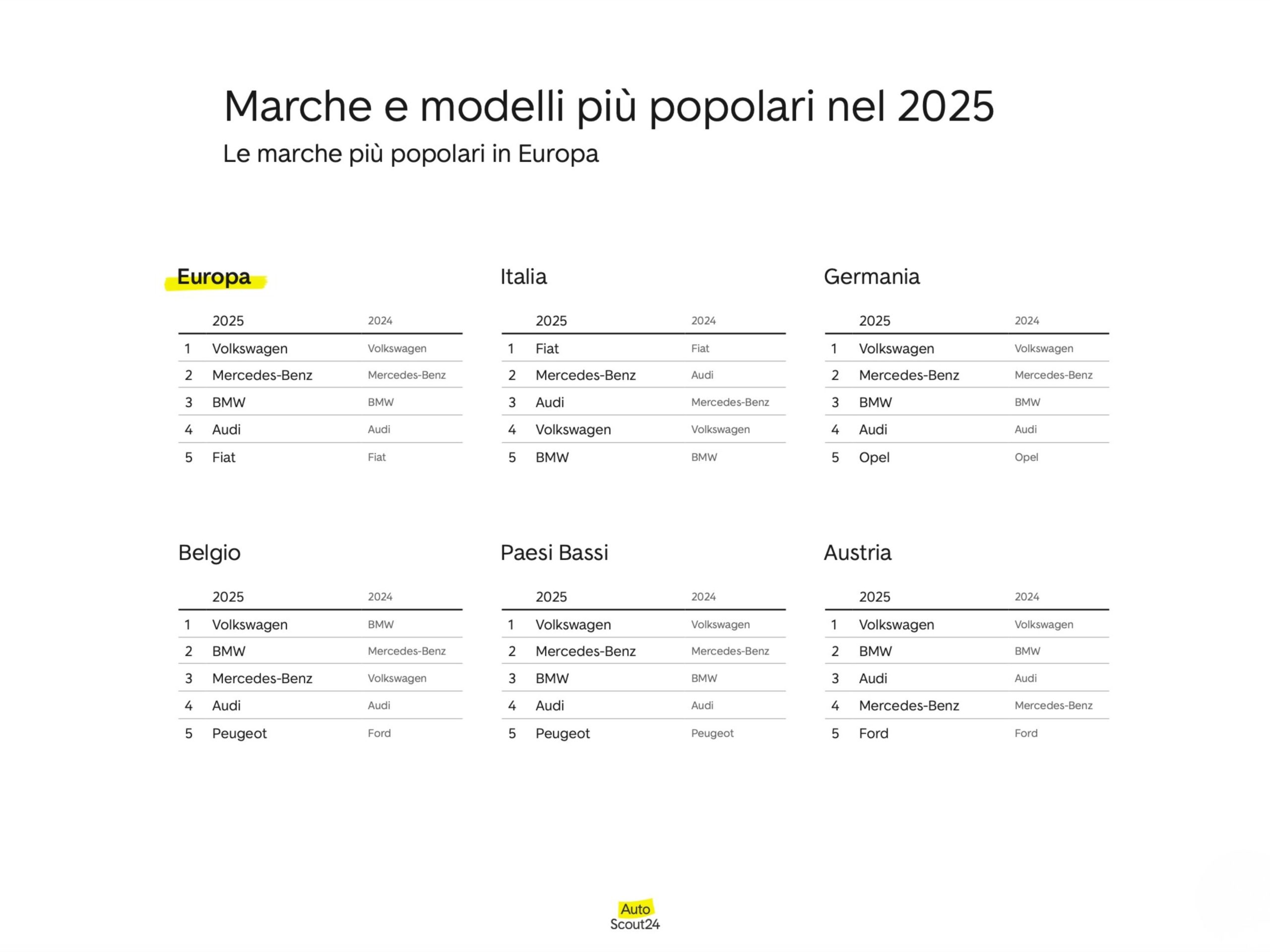 Dal punto di vista dei brand, Volkswagen si conferma il marchio più richiesto in Europa, davanti a Mercedes-Benz e BMW, mentre Tesla resta il riferimento nel mercato delle elettriche usate in quasi tutti i Paesi analizzati.