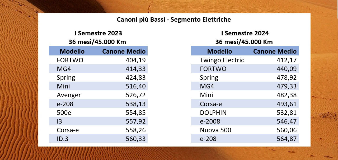 Ritornando alle Bev, nel 2024 è entrata nell’offerta on-line la Renault Twingo Electric. La city car francese ha scalzato dal primo posto dei canoni più bassi la Smart Fortwo che deteneva questa posizione nel primo quadrimestre 2023.