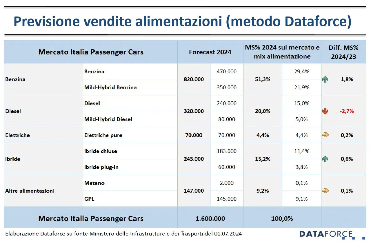 Nell’analisi di Dataforce anche i dati sulle immatricolazioni di auto elettriche in questa prima metà del 2024, con una stima sull’anno completo.