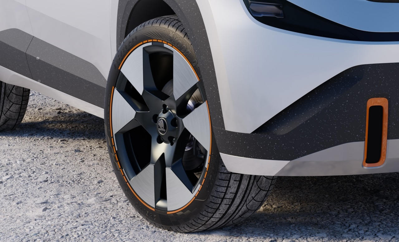 City Suv elettrico SkodaI passaruota hanno un rivestimento che dà risalto alla aerodinamicità. A concorrere al “cx” anche la linea del tetto,  bassa e leggermente inclinata fino a fondersi con lo spoiler.