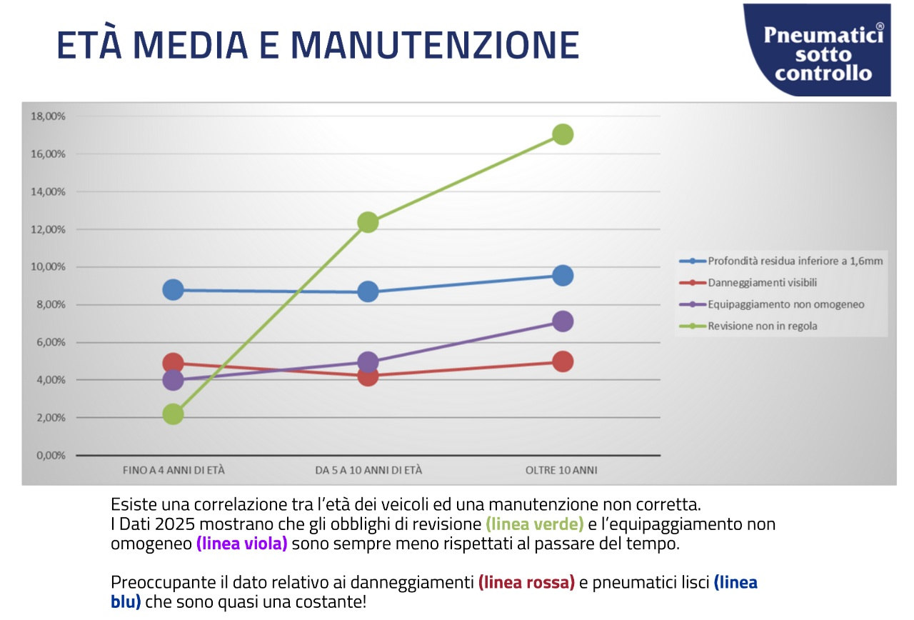 Un dato colpisce in particolare: la percentuale di pneumatici lisci rimane costante attorno al 10%, indipendentemente dall’età del veicolo. I danneggiamenti visibili si attestano invece al 5%.