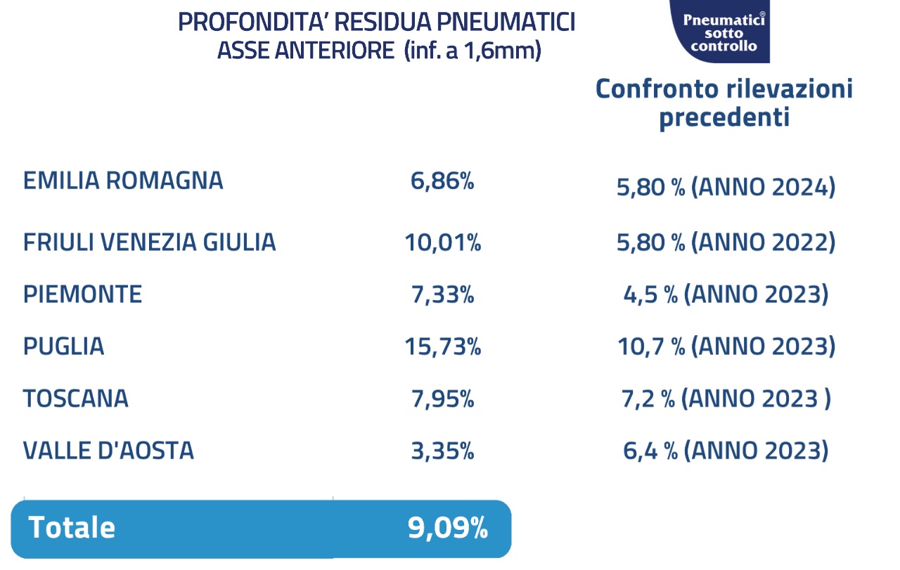 A comunicare i tradizionali dati dei controlli effettuati su strada è la Polizia Stradale e Assogomma, nell’ambito del progetto Vacanze Sicure. L’edizione 2025 ha visto monitorare quasi 10.000 vetture tra maggio e giugno, in 6 regioni: Emilia-Romagna, Friuli-Venezia Giulia, Piemonte, Puglia, Toscana e Valle d’Aosta.