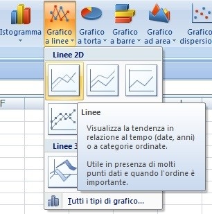 A tale scopo occorre selezionare le celle comprese tra D1 ed E6, attivare la barra multifunzione “INSERISCI” e cliccare sul pulsante “grafico a linee”.