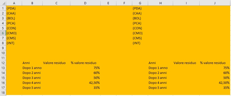 Nella cella E2: =((AUTO!$G$3+AUTO!$G$4)/$B2)+((AUTO!$G$5*AUTO!$G$6)/100)+((AUTO!$G$7+AUTO!$G$8)/100000)+((AUTO!$G$2-AUTO!$H13)/$B2*$C2)+(((1+AUTO!$G$9)^($C2-1))*AUTO!$G$9*AUTO!$G$2/$B2)