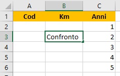 A tale scopo si scrive su B3: =SE(B2=0;”Confronto”;””). Nella cella D2 si richiamano i valori dei costi relativi al chilometraggio selezionato nel menu della cella B2. A tale scopo occorre scrivere: