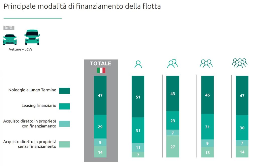Il 95% degli intervistati in Italia, afferma che il parco veicoli rimarrà stabile o aumenterà nei prossimi tre anni. La crescita del business e lo sviluppo di nuove attività sono le più importanti motivazioni. Quindi l’intenzione di trattenere e attrarre talenti (44% contro il 24% del 2022) e la previsione di proporre veicoli aziendali anche ai dipendenti che non ne avrebbero diritto (22%). Tra le sfide più importanti, i processi di transizione energetica e le iniziative per migliorare la sicurezza dei driver. Anche quest’anno, il noleggio a lungo termine si conferma la principale modalità di finanziamento della flotta. Il 47% delle aziende intervistate lo utilizza, +12% rispetto a 2022. La centralità del noleggio è una certezza anche per le società piccole.
