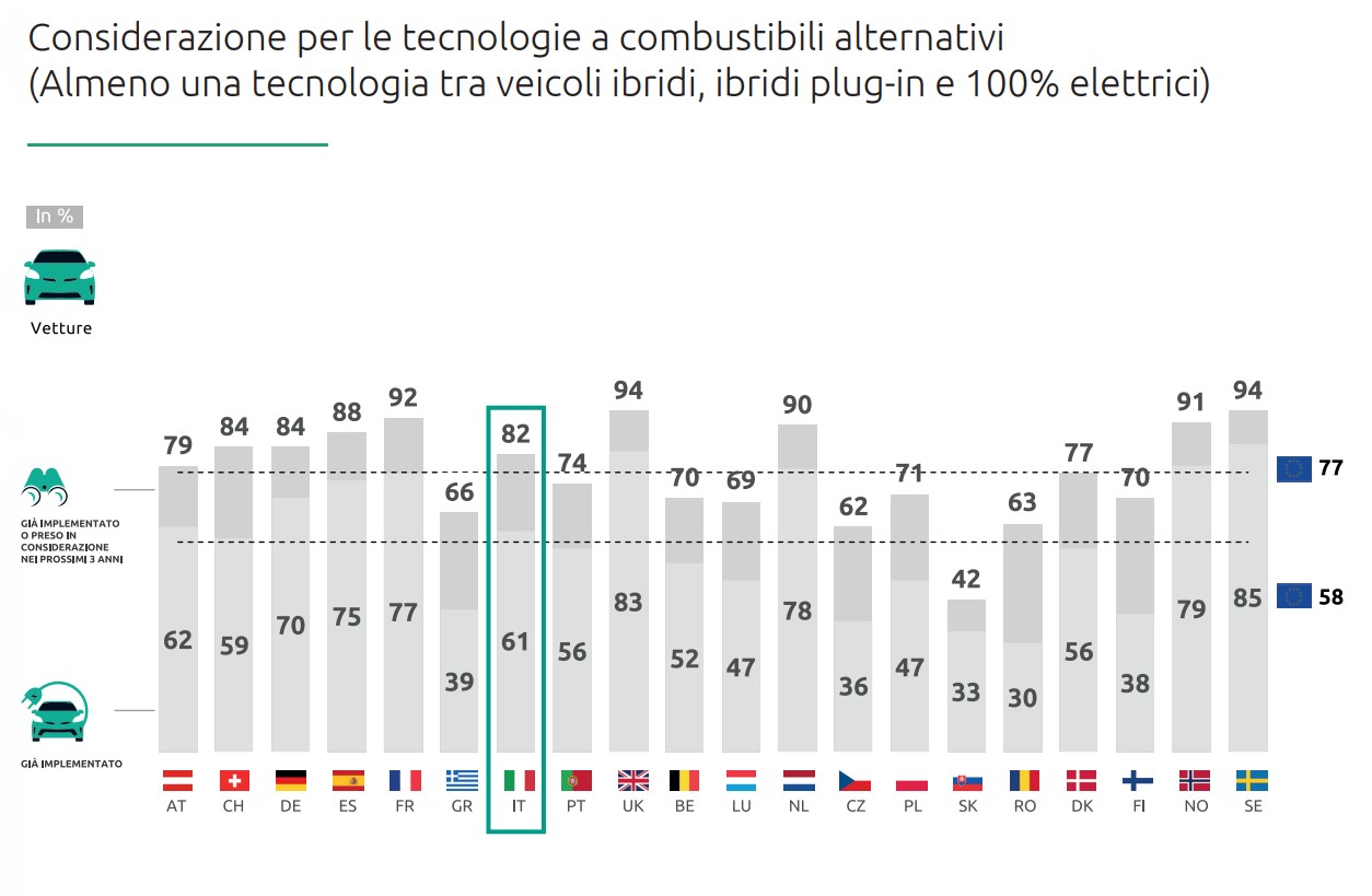 In linea con la tendenza europea, le tecnologie alternative salgono, per le auto. Il 61% delle aziende usa già almeno una tecnologia alternativa (l’82% nell’orizzonte dei tre anni) contro il 42% del 2021.