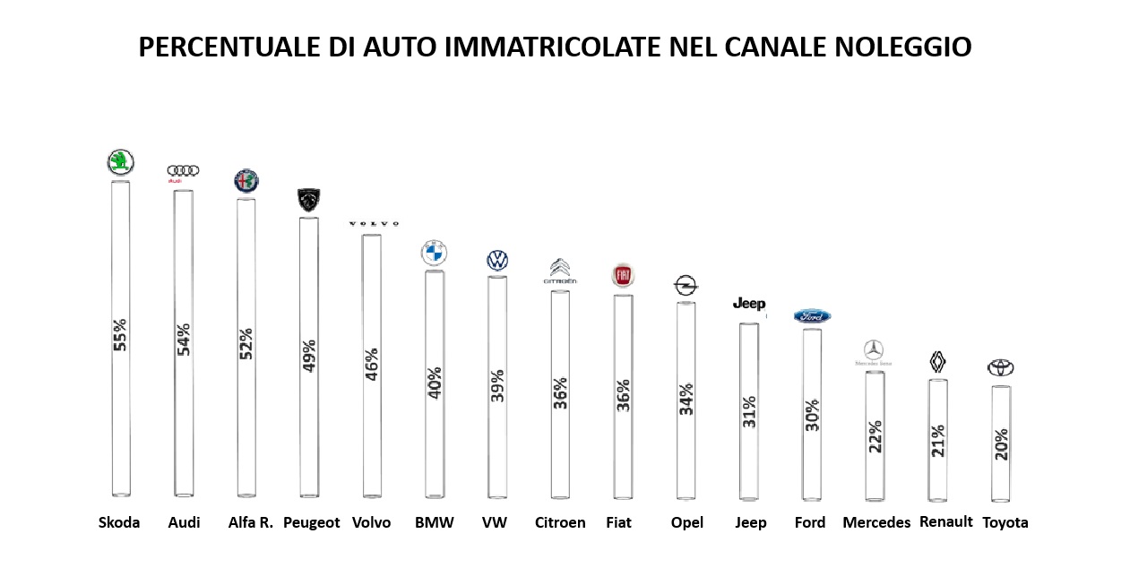 Non tutti i top 15 brand, che rappresentano il 78% del mercato in valore, hanno la medesima penetrazione nel canale noleggio, sia breve che lungo termine. Nel senso che ci sono alcuni costruttori che hanno nelle immatricolazioni auto a uso noleggio una forte percentuale delle proprie vendite complessive.