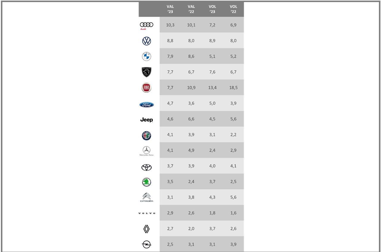 «Il brand Fiat ha lavorato bene sul mix e sul prezzo – prosegue del Pier Luigi del Viscovo – cedendo in valore solo 3 punti rispetto ai 5 della quota in volume. Questè è infatti passata da 18,5 a 13,4%».