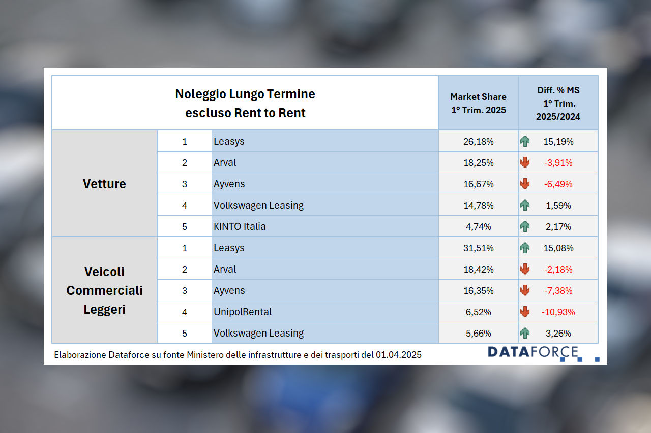 Più o meno sullo stesso livello di immatricolazioni dello scorso anno, invece, è Arval (leader di mercato nel 2024 e ora seconda): circa 18.500 nuove targhe, 400 in meno, e una quota di mercato del 18%.
