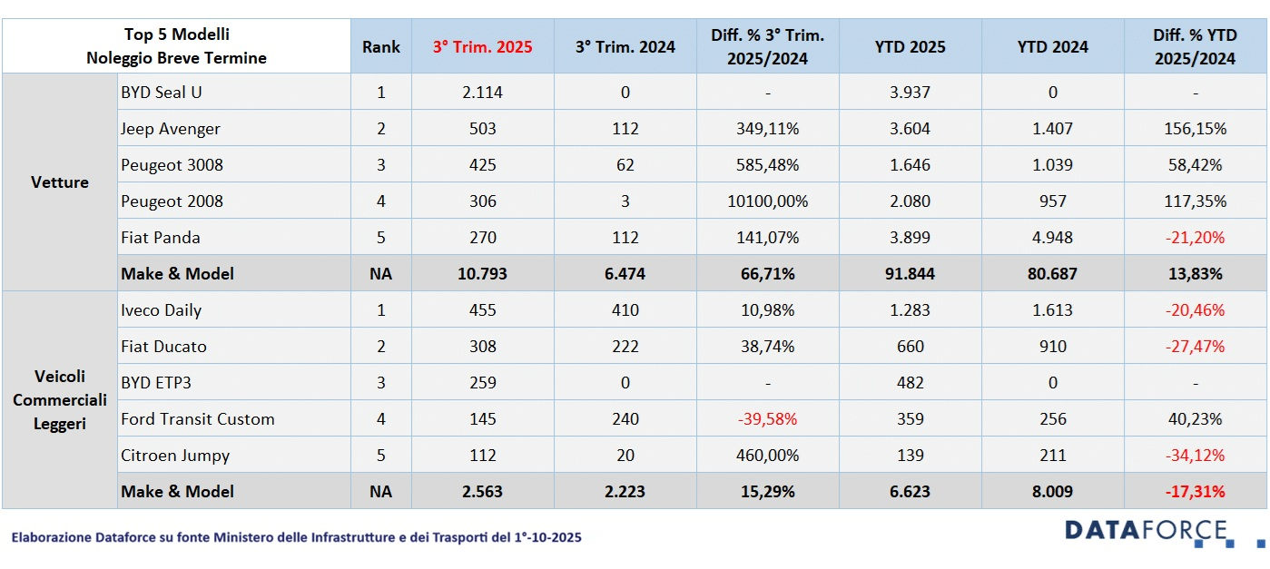 Nel noleggio a breve termine la Top 5 delle vetture nel terzo trimestre vede salire per la prima volta al primo posto la BYS Seal U. Nel secondo trimestre 2024, questo modello non era nemmeno in classifica perché in fase di lancio in Italia.