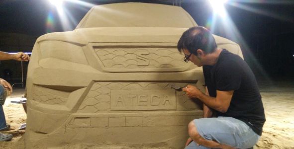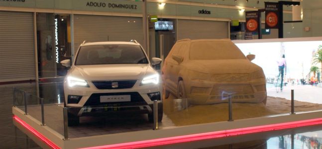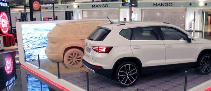 Una teca, naturalmente intitolata “Created in Barcelona“, al Terminal 1 del Prat, lo scalo della capitale catalana, che mostra ai suoi passeggeri un Seat Ateca di sabbia accanto a un vero Suv della Casa di Martorell e al video che mostra il making-of dell’opera.