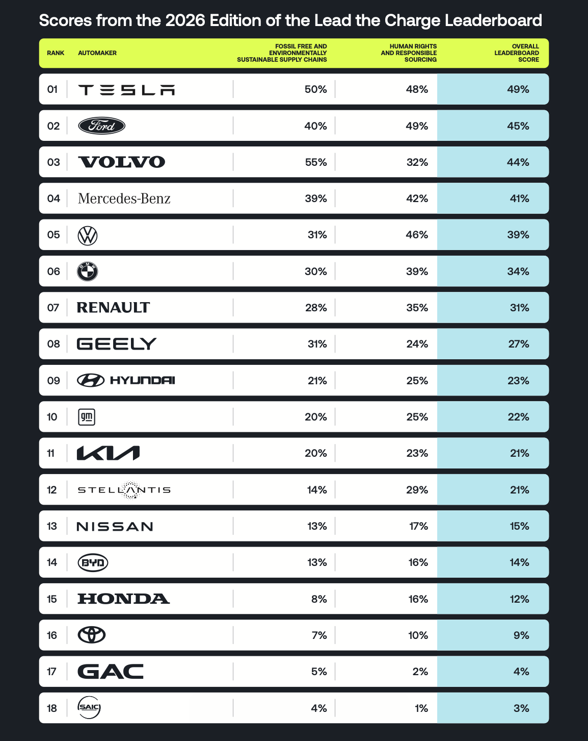 È proprio questo l’obiettivo della Lead the Charge Auto Supply Chain Leaderboard 2026. Si tratta dell classifica internazionale giunta alla sua quarta edizione che analizza l’impegno dei principali costruttori automobilistici nel costruire catene di approvvigionamento più pulite, responsabili e libere dai combustibili fossili.