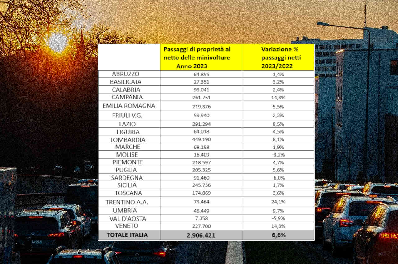 Secondo l’elaborazione del Centro Studi di AutoScout24 su base dati Aci, nel 2023 rispetto al 2022 i passaggi di proprietà di auto usate sono aumentati del 6,6%, pari a 2.906.421 atti. La maggior crescita in Trentino-Alto Adige (+24,1%), Campania e Veneto (entrambe +14,3%).