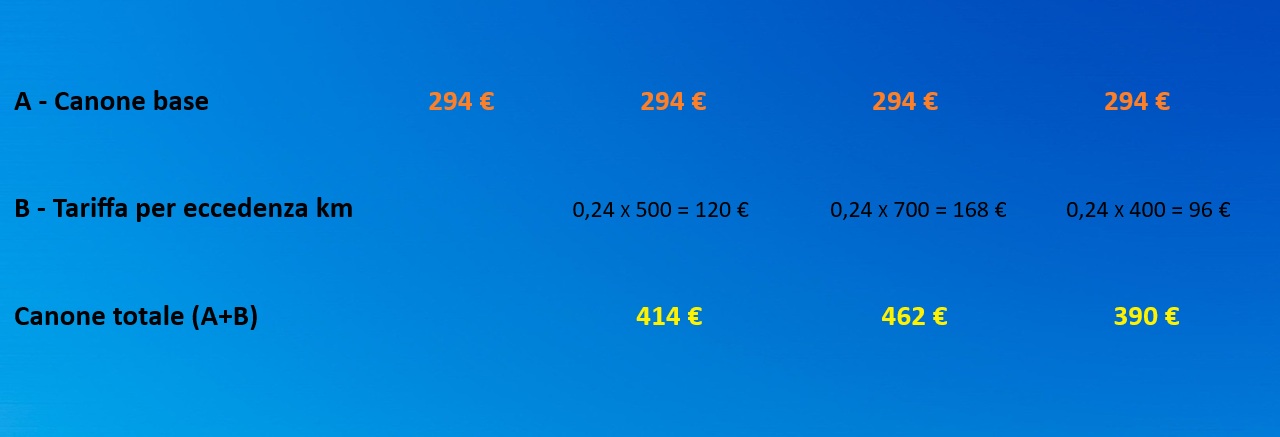 Per tutta la durata del contratto il canone base è fisso. Al raggiungimento della soglia dei 3.000 km, ogni chilometro eccedente sarà fatturato su base mensile al costo di 24 centesimi di euro + IVA, che si aggiunge al canone base.