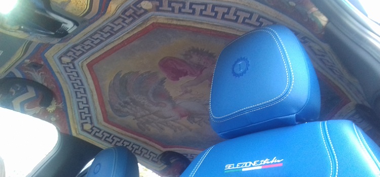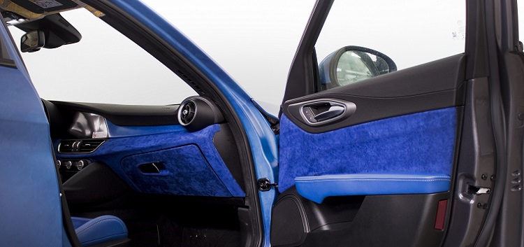 Oltre al “soffitto” affrescato, l’interno della Giulia Grand Tour vede una selleria realizzata da Alcantara di colore blu lapislazzulo, proprio per questa creazione. Il materiale che riveste la plancia ricorda la polvere di lapislazzulo che veniva utilizzata dagli artisti del Rinascimento nelle loro opere d’arte.