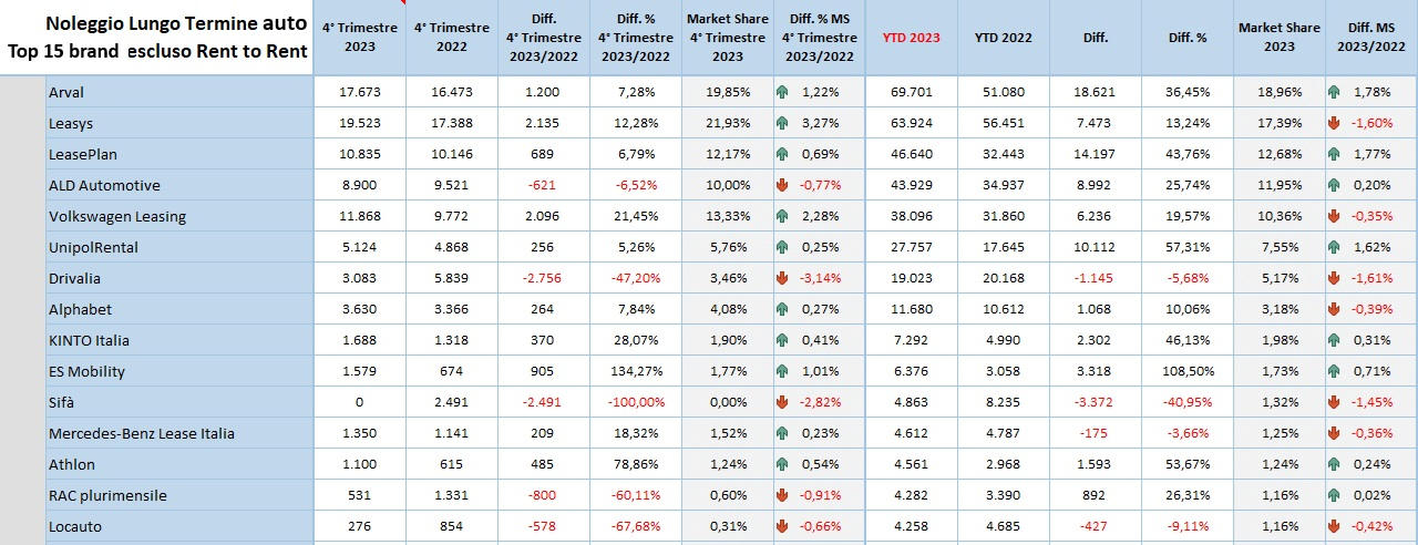 Guardando le auto, sono 2 i fattori determinanti del 2023 che hanno agito sul numero finale. Da una parte il rinnovo forzato dei contratti che erano stati prorogati prima per la pandemia e poi per la mancanza di componenti elettronici. Dall’altra, l’”effervescenza” degli assetti societari delle società di noleggio che tra acquisizioni, fusioni e incorporazioni hanno cambiato il volto del mercato.