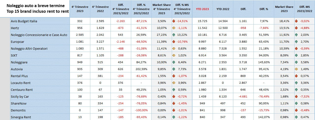 Parlando di noleggio auto a breve termine, nel 2023 Avis Budget Italia è il leader, pur perdendo il 3% di quota. E’ leader con 15.725 vetture davanti ad Hertz Italiana, che si ferma a 11.542 immatricolazioni e quota a -5%.
