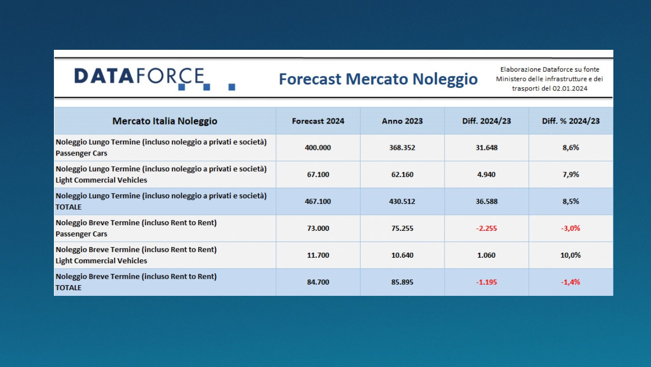 Come tradizione di inizio anno arrivano i dati sul noleggio auto con le previsioni di Dataforce per il 2024 e i numeri relativi ai 12 mesi appena trascorsi.
