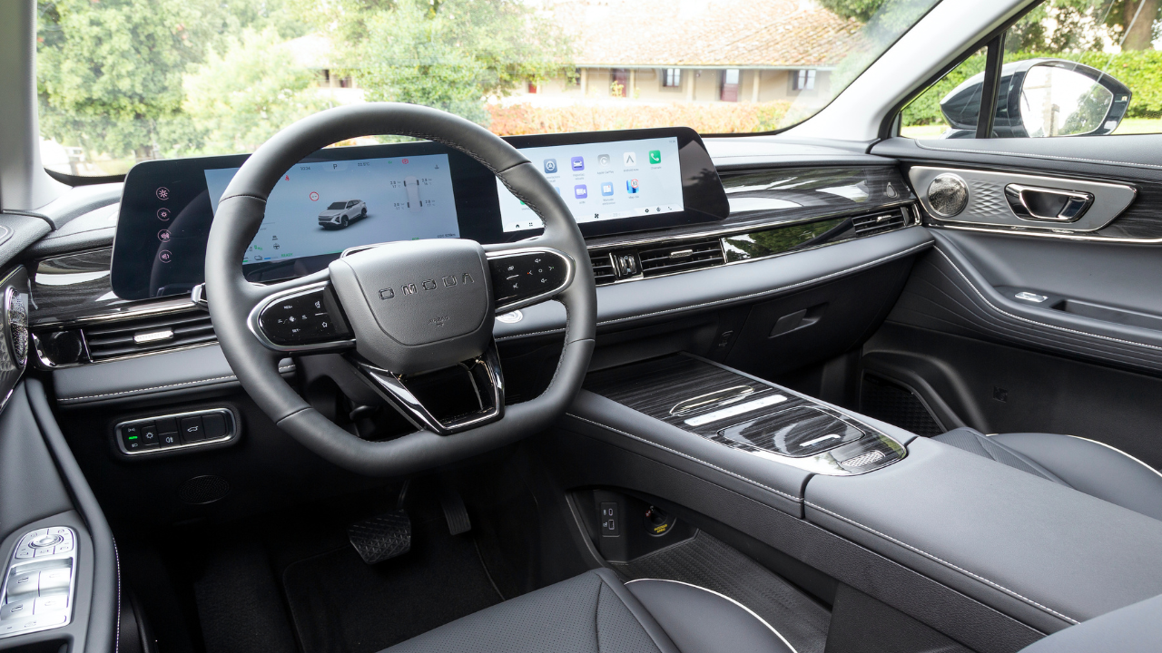 Gli interni confermano la qualità già apprezzata sulle versioni termiche ed elettriche. L’abitacolo è dominato da un doppio display da 12,3”, compatibile con Apple CarPlay e Android Auto (entrambi wireless), mentre materiali morbidi e finiture curate rivestono plancia e pannelli porta.