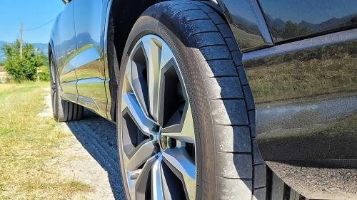 Da fuori, in evidenza i cerchi 20 pollici cinque razze, bicolor, la (molto) grande griglia frontale e i due “sportelli energia”: benzina e presa corrente, molto più usata la seconda, anteriore. Come anteriori sono motori, trasmissione e trazione.
