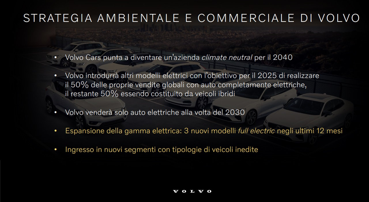 La strategia di Volvo Car Italia si inserisce nel contesto più ampio della strategia della casa madre. Questa si basa sull’elettrificazione e sull’abbattimento delle emissioni di CO2 lungo l’intera filiera di vita dell’auto e nella catena dei fornitori.
