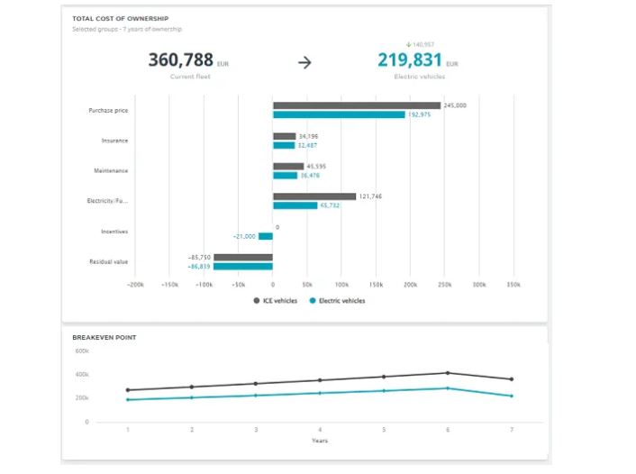 Si sfruttano i dati della propria flotta per valutare quanto si è pronti all’elettrificazione, stimando il costo totale di proprietà (TCO) per effettuare il passaggio all’elettrico, i costi operativi e il risparmio di CO2.