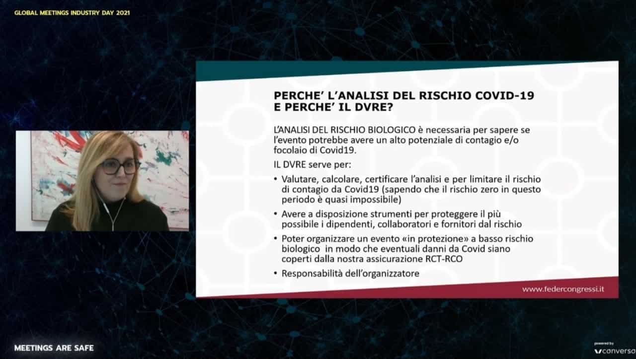 Sempre in tema di sicurezza, Alessandra Albarelli, portavoce istituzionale di Italialive e presidente di Federcongressi&eventi, ha illustrato il Dvre, strumento che analizza il rischio biologico degli eventi e indica come eliminare gli elementi che lo elevano, andando così ad abbatterlo.