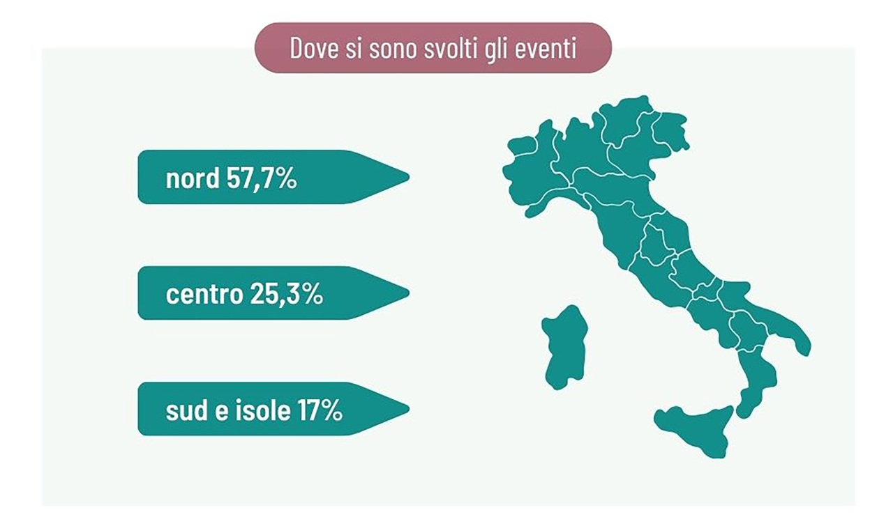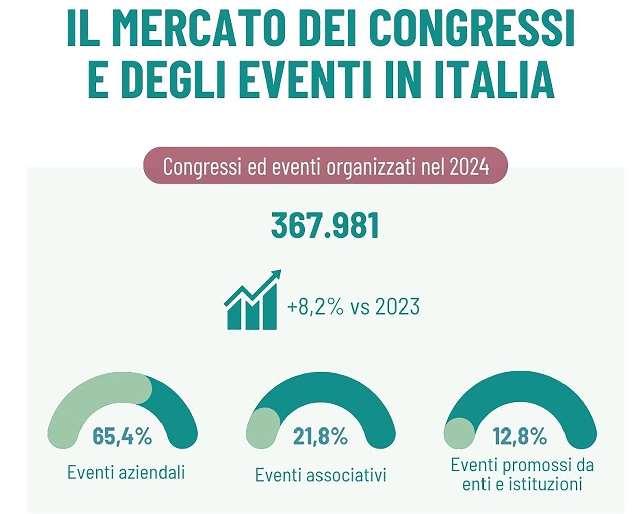 Infatti secondo la ricerca, nel 2024 gli eventi internazionali (cioè con partecipanti provenienti in percentuale significativa dall’estero) sono stati il 13,4% segnando una crescita di oltre 4 punti percentuali rispetto alla rilevazione precedente.
