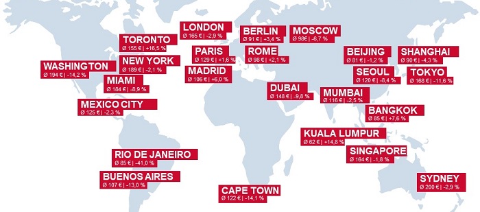 In Europa l’andamento tariffario è più discontinuo rispetto a quello registrato nelle destinazioni extra europee. Si registra, infatti, un incremento dei prezzi in numerose città, con punte massime (circa il 10% in più) ad Amsterdam (135 euro) e Praga (74 euro). Vi sono però anche mete in calo, con il significativo decremento di Lisbona (-7,95%), Oslo (-7,19%), Mosca (-6,67%) e Istanbul (-6,76%). Le città più care sono Zurigo (170 euro), Londra (165 euro) e Copenhagen (136 euro), anche se con un calo rispetto al 2017.