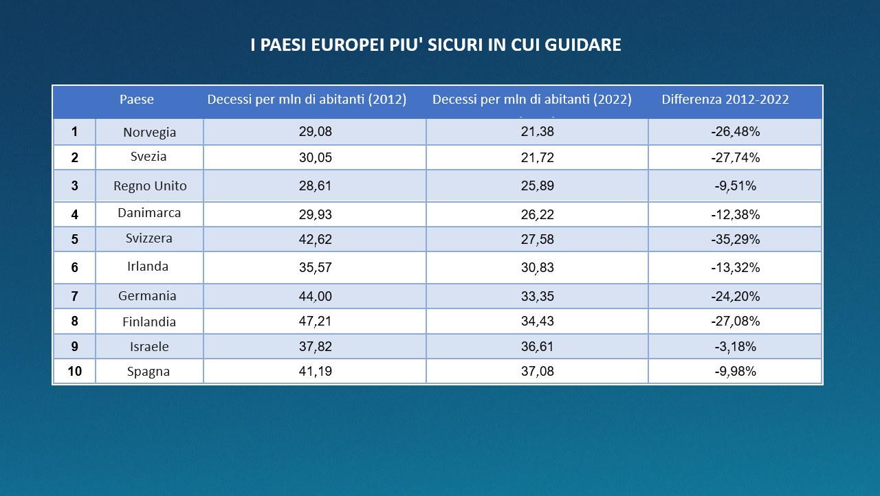 Nella classifica emerge che la Romania è (in media) il paese a più rischio sinistro, seguito da Serbia e Bulgaria mentre quello più sicuro è la Norvegia, seguita da Svezia e Regno Unito.