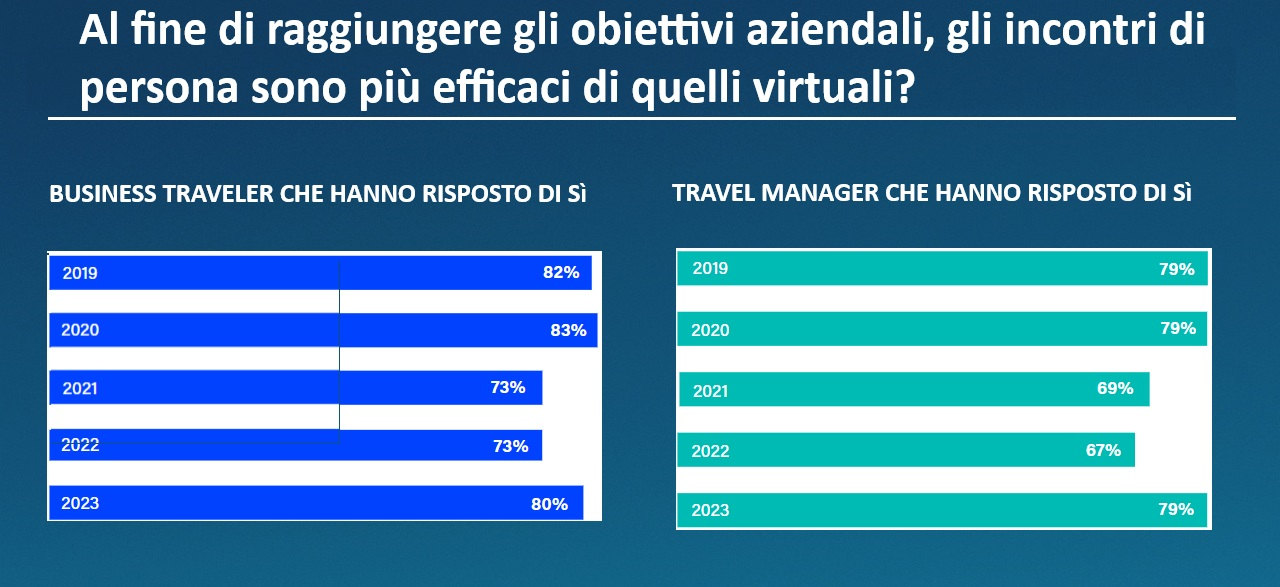 La ricerca sul business travel ha evidenziato anche l’importanza dei viaggi d’affari. Nel 2019 per il 91% dei viaggiatori e dei travel manager la risposta era inequivocabilmente sì. Dopo un prevedibile calo durante gli anni della pandemia, nel 2023 queste cifre sono tornate ai livelli del 2019 (con un leggerissimo calo per i traveler).