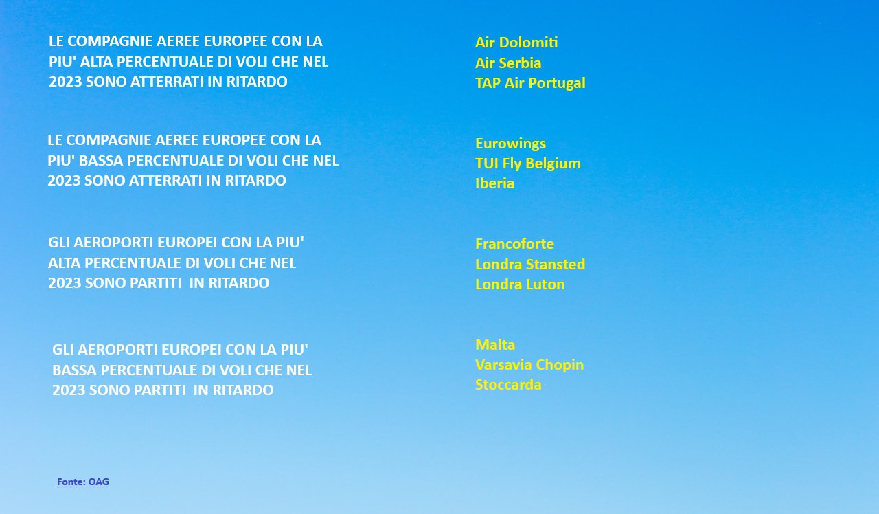 Intanto, con la stagione estiva che entra è alle porte e che si prevede porterà milioni di visitatori in Europa, la britannica Oag – fornitore di dati nel settore aeronautico – ha curato un rapporto sui tassi di ritardo e di cancellazione dei voli nei principali scali del continente.