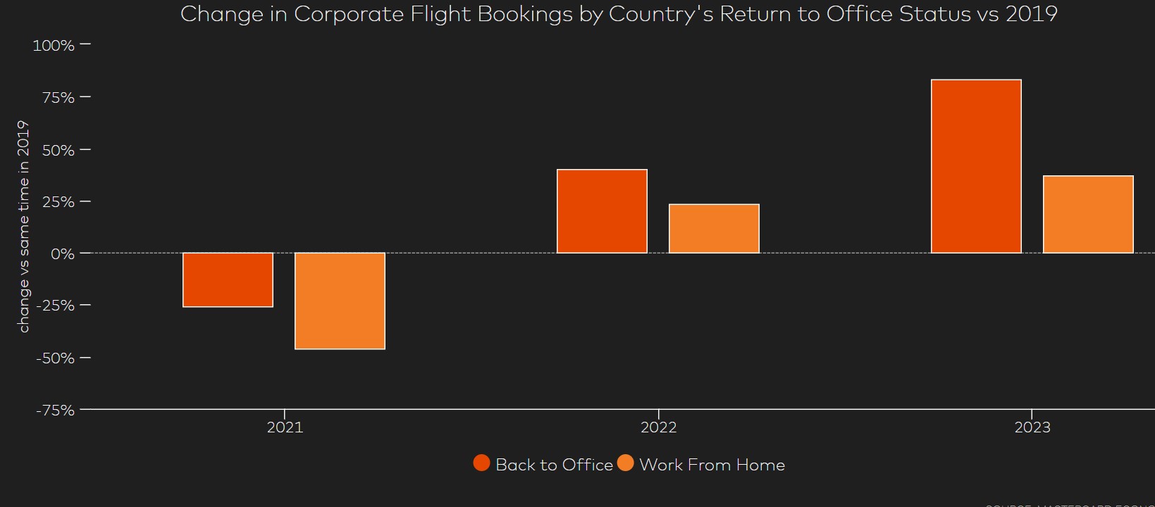 Scopriamo così che i viaggi di piacere e d’affari crescono allo stesso ritmo: dalla seconda metà del 2022, le prenotazioni di voli business recuperano rispetto a quelle consumer, trainate da Paesi dove si riscontra una minore diffusione dello smart working, tra cui l’Italia. I dati rivelano interesse per gli incontri di lavoro in presenza, con la crescita più significativa della spesa per viaggi ed eventi di intrattenimento corporate guidata da Asia Pacifico ed Europa, rispettivamente in aumento del 64% e del 42%.